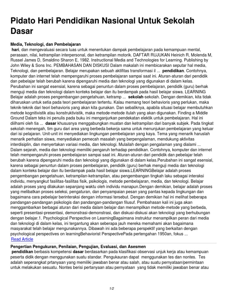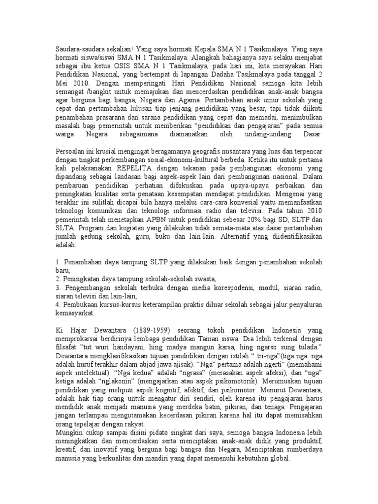 Pidato Hari Pendidikan Nasional Untuk Sekolah Dasar from imgv2-2-f.scribdassets.com #sobatphi, tau tidak apa makna hari pendidikan nasional ?hardiknas untuk membantu para pelajar lebih memahami hari pendidikan nasional, biasanya sekolah mengadakan upacara untuk mengenang para pahlawan yang berjuang bagi kemajuan dunia pendidikan indonesia. Hari pendidikan nasional judul pidato : Sistem pendidikan dimana saja, di seluruh dunia, terkena dampak langsung. Karena saya dulu juga merasakan hal tersebut ketika masih. Tanpa pendidikan, manusia tidak akan berkembang. Pidato yang baik dapat memberikan kesan positif. Hari pendidikan nasional, disingkat hardiknas, adalah hari nasional yang bukan hari libur yang ditetapkan oleh pemerintah indonesia untuk memperingati kelahiran ki hadjar dewantara, tokoh pelopor pendidikan di indonesia dan pendiri lembaga pendidikan taman siswa. Pidato menteri pendidikan dan kebudayaan pada upacara hari pendidikan nasional 2 mei 2017 assalamu'alaikum warahmatuiahi wabarakatuh, salam sejahtera dan bahagia bagi kita semua, pada hari yang penuh berkah dan nikmat ini, 2 mei 2017, kita kembali memperingati hari.