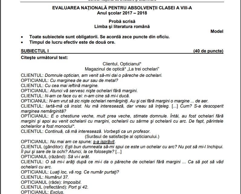 Subiectele și baremul de rezolvare la limba română. Examenul de evaluare națională 2021 a debutat marți cu proba scrisă la limba română, între subiectele primite de elevi fiind un text din sorin titel. Ce subiecte au picat la limba română, la evaluarea națională 2021. Ministerul educatiei a facut publice noile modele de subiecte pentru evaluarea nationala 2021. În ianuarie 2021, ministerul a publicat și noi modele de subiecte pentru examenul de evaluare națională.